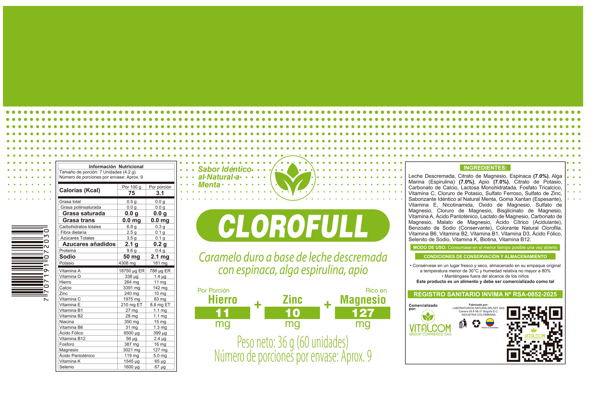 💊 El Clorofull de Vitalcom es un suplemento en pasta tipo caramelo duro a base de leche descremada, espinaca, algas espirulina y apio. Su fórmula, enriquecida con hierro, zinc y magnesio, apoya la salud inmunológica y mejora la vitalidad. Ideal para quienes buscan un impulso energético natural y un mejor bienestar general, contribuyendo también a la salud digestiva.